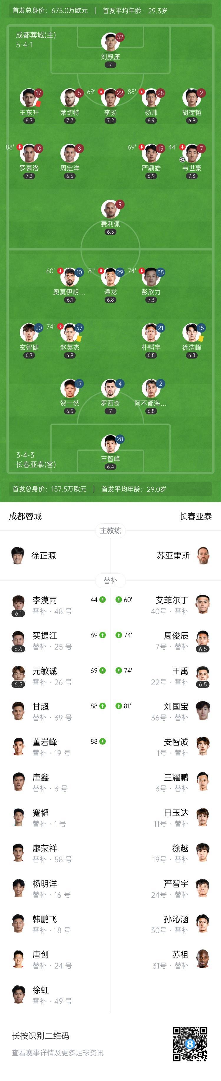 下半场补时6分钟。最终全场比赛结束,成都蓉城1-0长春亚泰。