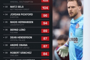 体育资讯4月15日讯 Squawka统计了本赛季英超扑救次数排行榜,弗莱肯位列第1,奥纳纳第8。
